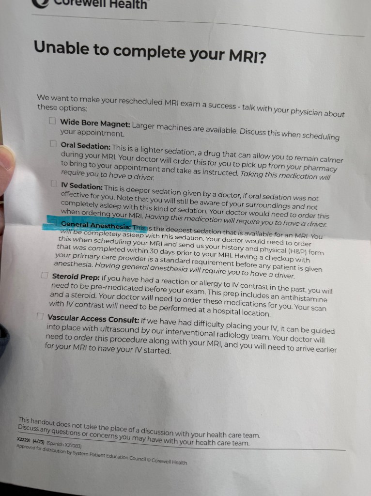 Olmadı MRI, bayıltamadılar. Kalbim eski sağlığından uzak olduğundan dolayı, az ilaç verdiler ve sakinleşmeme rağmen, işlem iptal oldu. Eve gelince uykum geldi. Biraz geç etki etti verilen ilaçlar ama bayılmadım işlem sırasında. Şimdi Genel Anestezi ile deneyecekler. Aylardır bekliyordum şunun için. Yazık oldu. Şimdi 1-2 ay daha beklerim kesin.